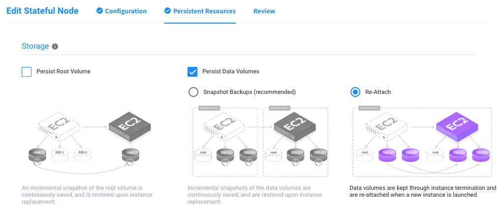 This method is recommended for large data volumes. The same EBS volume is detached from the original node and reattached to the newly launched node. If the new node is launched in a different availability zone, a snapshot is used to create a new volume and attach it to the new node (as volumes cannot be migrated between availability zones). Initially, volumes can be created based on the AMI block device mapping upon the stateful node's first resume, or attached via the AWS console. The same volumes are maintained as long as the node is launched within the same availability zone.